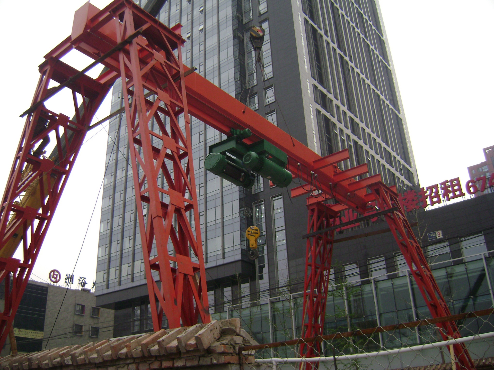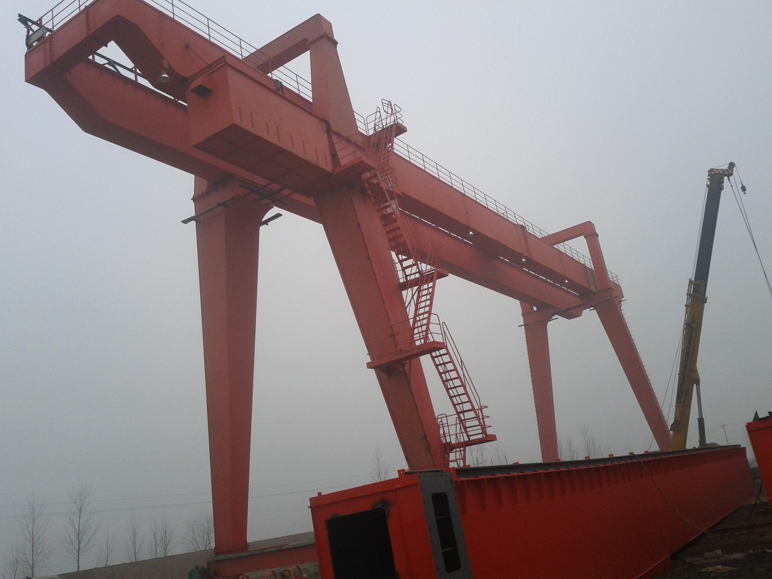 它的金屬結(jié)構(gòu)像門(mén)形框架,承載主梁下安裝兩條支腳,可以直接在地面的軌道上行走,主梁兩端可以具有外伸懸臂梁。門(mén)式起重機(jī)(又稱(chēng)龍門(mén)起重機(jī))是橋架通過(guò)兩側(cè)支腿支撐在地面軌道上的橋架型起重機(jī)。在結(jié)構(gòu)上由門(mén)架、大車(chē)運(yùn)行機(jī)構(gòu)、起重小車(chē)和電氣部分等組成。有的門(mén)式起重機(jī)只在一側(cè)有支腿,另一側(cè)支撐在廠房或棧橋上運(yùn)行,稱(chēng)作半門(mén)式起重機(jī)。門(mén)式起重機(jī)的門(mén)架上部橋架(含主梁和端梁)、支腿、下橫梁等部分構(gòu)成。為了擴(kuò)大起重機(jī)作業(yè)范圍,主梁可以向一側(cè)或兩側(cè)伸出支腿以外,形成懸臂。也可采用帶臂架的起重小車(chē),通過(guò)臂架的俯仰和旋轉(zhuǎn)擴(kuò)大起重機(jī)作業(yè)范圍。