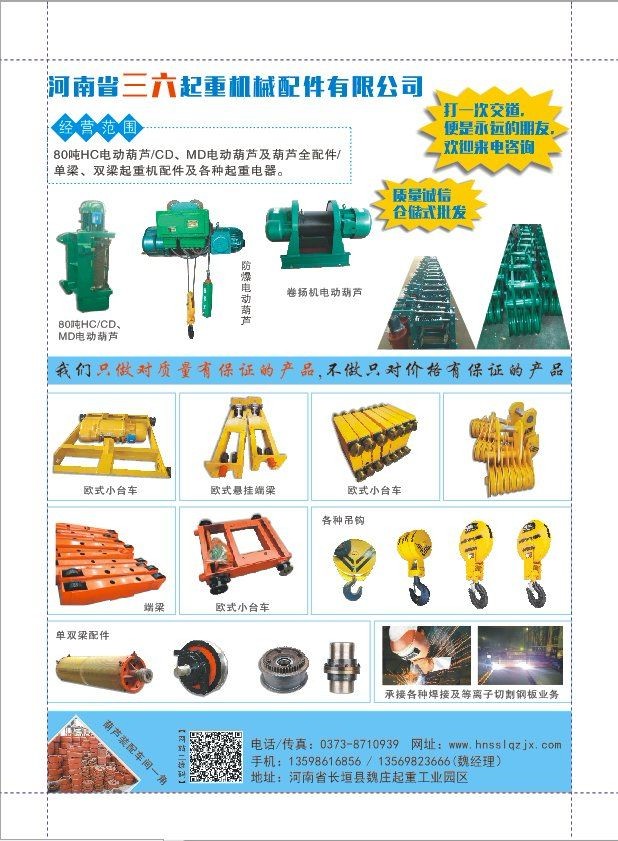 河南省三六起重機械配件有限公司專業生產及銷售起重配件,主要銷售:CD1、MD、HC、BCD各種型號電動葫蘆、葫蘆配件、電機、葫蘆減速機、葫蘆全配件、起重機LD300輪、LD400輪、雙梁起重機輪組、卷筒組、吊鉤組、聯軸器、電纜卷筒、起重機安全滑線、聚氨酯緩沖器、彈簧緩沖器、液壓緩沖器、制動器、旋臂吊、液壓平臺等起重機配件。