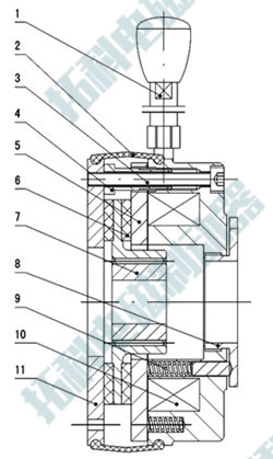 1-釋放手柄 2-防塵罩 3-安裝螺釘 4-空心螺栓 5-銜鐵 6-制動盤7-齒輪套 8-調節螺母 9-彈簧 10-磁軛組件 11-安裝板