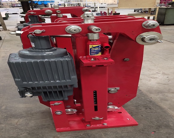 (5)、將已打開的制動器緩慢平穩的移動到其安裝的位置,穿上地腳螺栓,并松松擰上螺母。注意:在移動制動器時,嚴禁磕碰推動器。