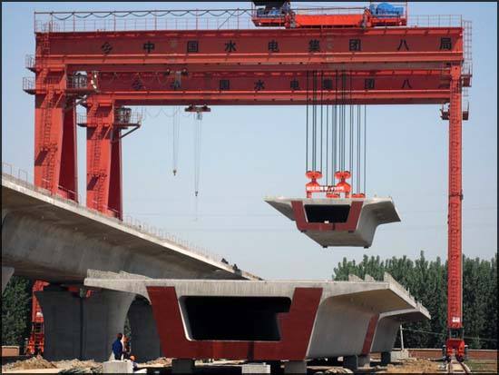 提梁機(jī)既可兩臺(tái)配合抬吊預(yù)制梁,也可以單臺(tái)起重機(jī)配雙吊具起吊預(yù)制梁,兩臺(tái)同時(shí)起重的提梁機(jī)各自的起重量一般為450噸,單臺(tái)起重的提梁機(jī)起重量通常可達(dá)900噸。它配置支腿行走、天車行走及天車起吊設(shè)備,可以實(shí)現(xiàn)全方位機(jī)械化動(dòng)作。主要用于將預(yù)制梁從制梁臺(tái)提吊至存梁臺(tái)位,預(yù)制梁養(yǎng)護(hù)完成后將其從存梁臺(tái)位吊運(yùn)到運(yùn)梁車上。作為起重設(shè)備完成架橋機(jī)的組裝和拆卸。還用于架設(shè)墩身不高的旱橋。