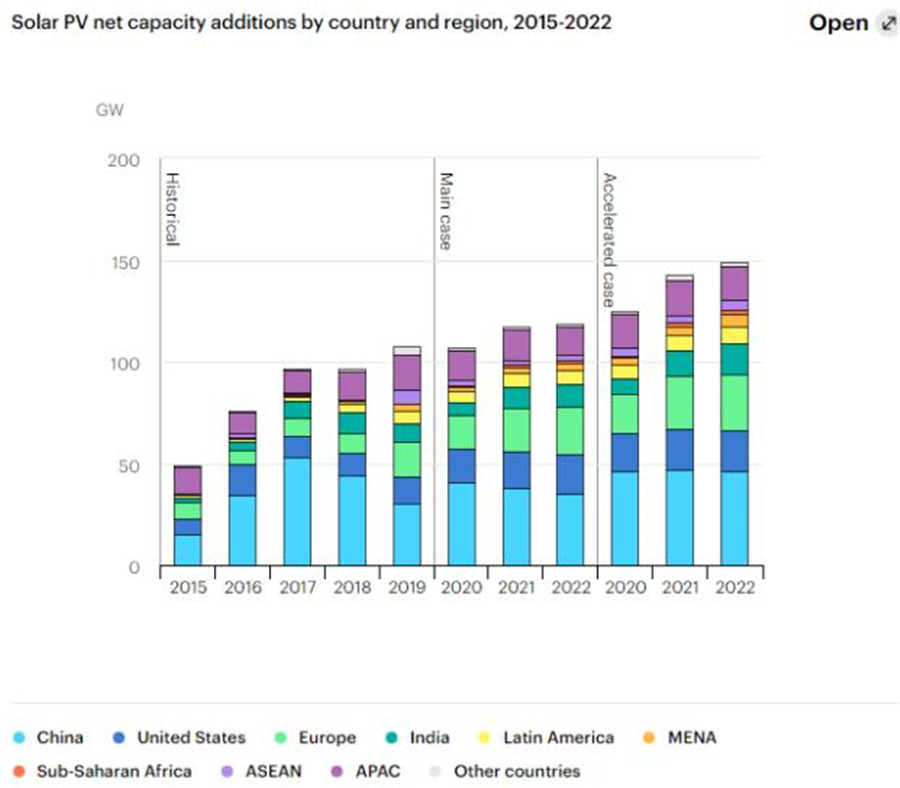 根據IEA的數據顯示,雖然起步較晚,中國的太陽能發電裝機量近年來發展迅速,光伏發電量快速增長。