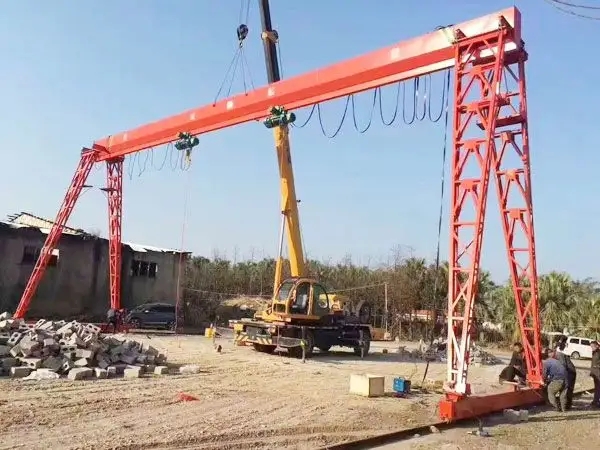 它的金屬結構像門形框架,承載主梁下安裝兩條支腳,可以直接在地面的軌道上行走,主梁兩端可以具有外伸懸臂梁。