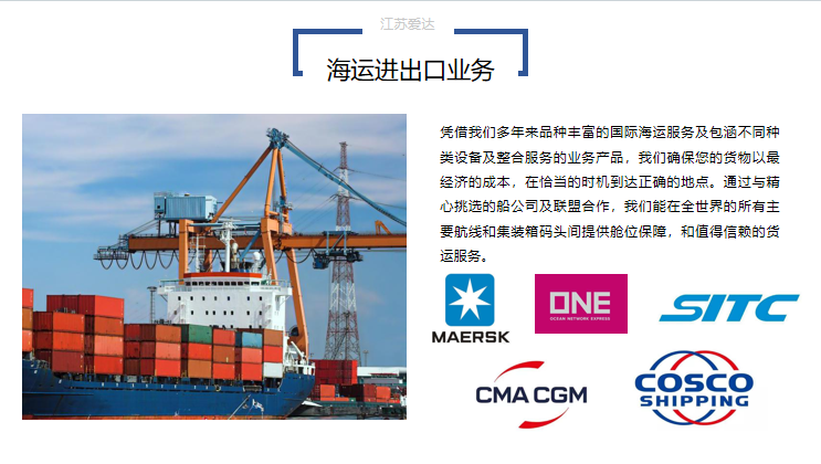 全球起重機機械網供應商江蘇愛達國際貨運代理有限公司供應海運進出口業務,為您提供詳細的產品報價、參數、圖片等商品信息,如需進一步了解海運進出口業務,請與廠家供應商直接聯系,請在聯系時說明是在全球起重機械網看到這條商機的。